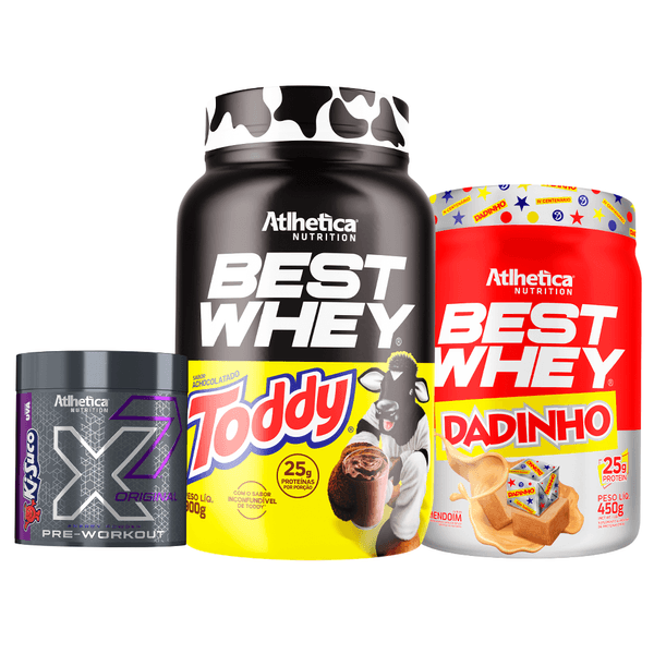 Uma combinação que une inovação e sabores icônicos que todo mundo conhece e ama: BEST WHEY® sabor achocolatado TODDY® e BEST WHEY® Dadinho, com 25 g de proteína por porção e altíssima qualidade nutricional em cada scoop. Para completar, o pré-treino X7® Original sabor Ki-Suco Uva entrega um sabor refrescante e nostálgico, aliado a uma fórmula exclusiva, oferecendo mais energia, foco e performance em cada exercício.