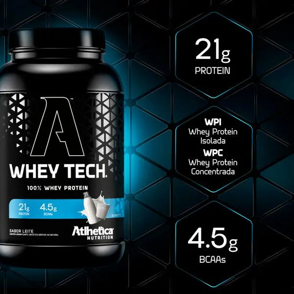"O Whey Tech da Atlhetica Nutrition é um suplemento alimentar de alta qualidade, desenvolvido para atletas e praticantes de atividades físicas. Composto por uma mistura de proteína concentrada e isolada do soro do leite, o Whey Tech é parte da linha de suplementos alimentares da Atlhetica Nutrition, que inclui produtos energéticos, proteicos, hidroeletrolíticos, funcionais, entre outros. SUGESTÃO DE PREPARO: Adicione ao liquidificador ou blender 30g (2 dosadores) e 200ml da bebida de sua preferência. RECOMENDAÇÃO DE USO: 30g (2 dosadores) 1 vez ao dia para indivíduos saudáveis a partir de 19 anos. PARA QUE SERVE: - Fornece 24g de proteínas por porção; - Auxilia no ganho de massa magra; - Contribui para a redução da fadiga muscular; - Promove maior saciedade; - Não contém glúten; - Disponível em diversos sabores deliciosos. INGREDIENTES: FÓRMULA WHEY TECH BLEND [Proteína Concentrada do Soro do Leite e Proteína Isolada do Soro do Leite], Cloreto de Sódio, Aromatizante, Espessante Goma Xantana, Edulcorantes Sucralose e Acesulfame de Potássio. ALÉRGICOS: CONTÉM DERIVADOS DE LEITE E SOJA. NÃO CONTÉM GLÚTEN. CONTÉM LACTOSE."